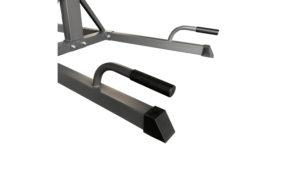 Верхние рукояти предназначены для выполнения подтягиваний различным хватом. Брусья отлично подойдут для отжиманий, а мягкие локтевые упоры создадут комфортные условия для прокачки пресса и спины. Пара нижних рукояток в передней части тренажера позволяет выполнять отжимания из положения лежа.